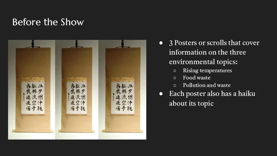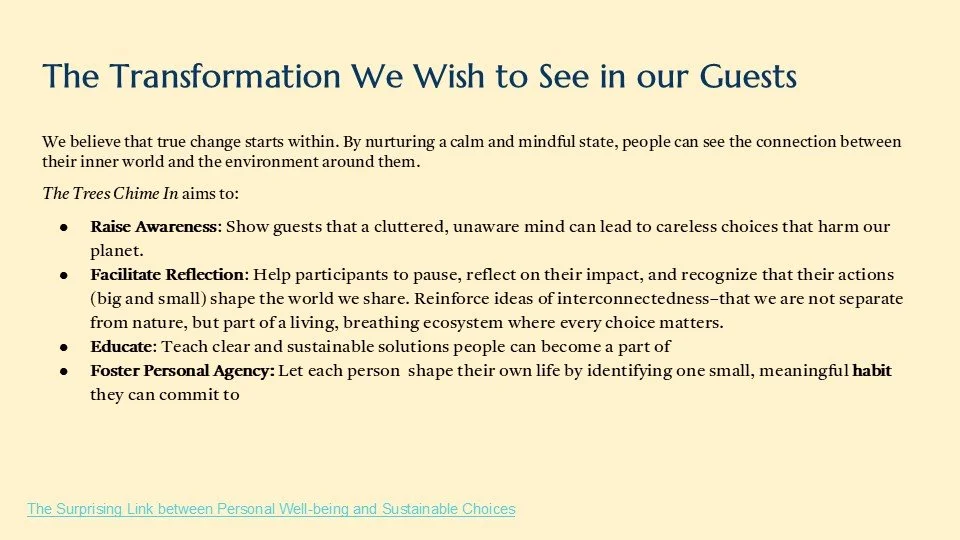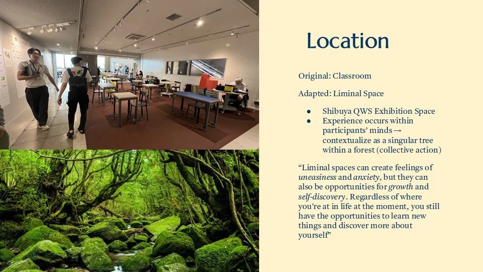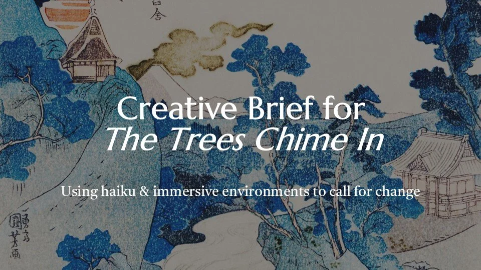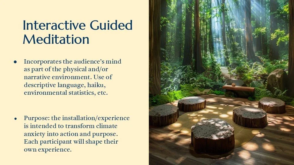 cultural installation offering a multi-sensory meditation guided by the voice of an ancient tree. Through haiku, haptics, and personal reflection, guests move from environmental awareness to committing to individual action, taking with them a seed of intention to cultivate change.