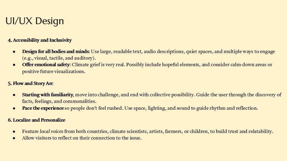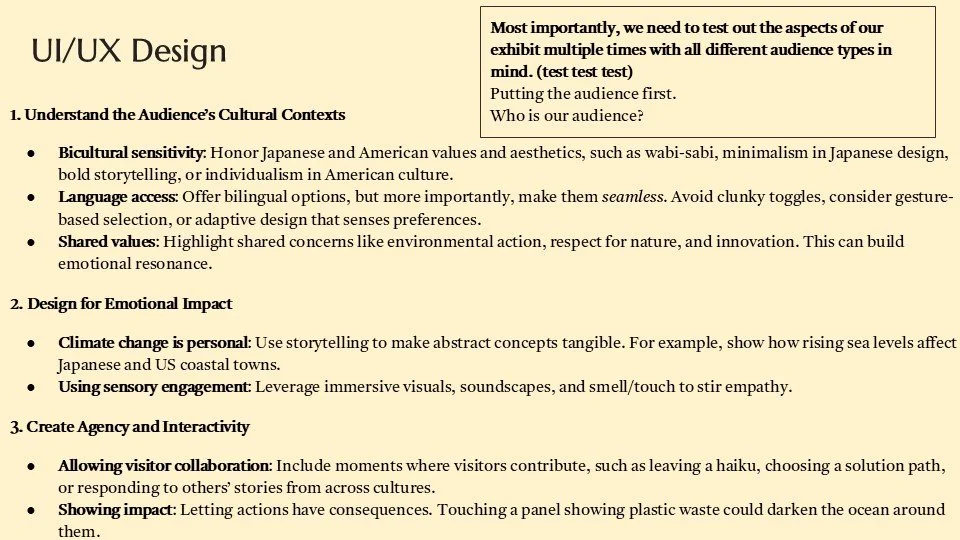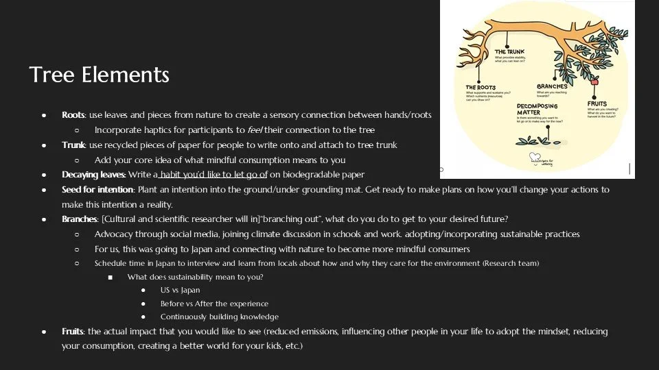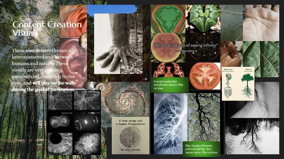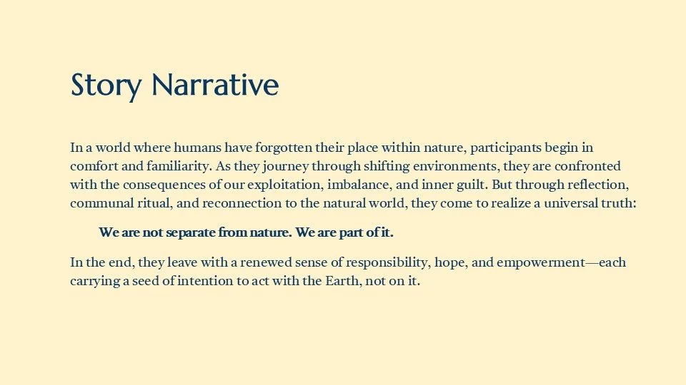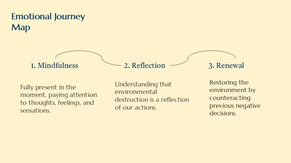 Through our Experience, participants go through 3 phases, mindfulness, reflection, and renewal. The emotional progression that we aimed to create through narrative is one that begins with a deep understanding of nature, followed by greater compassion towards the environment, and ending with a newfound sense of action regarding human treatment of the environment.