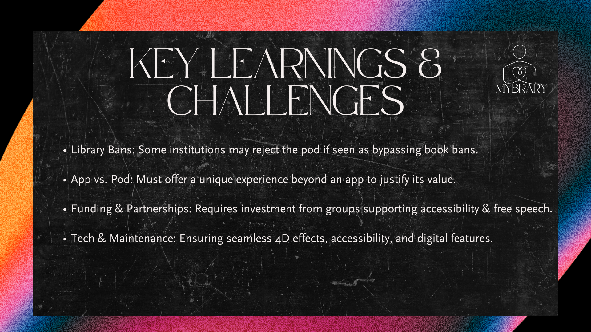 MyBrary is a wheelchair‑accessible, mini 4D library pod + companion app that lets readers privately engage with any book (including banned titles) using text‑to‑speech, haptics, and adaptive lighting/sound—turning reading into an immersive, inclusive experience.